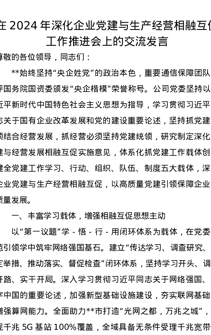 在2024年深化企业党建与生产经营相融互促工作推进会上的交流发言