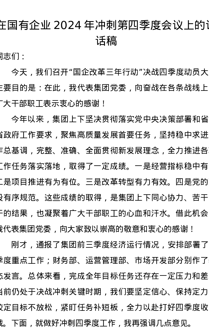 在国有企业2024年冲刺第四季度会议上的讲话稿