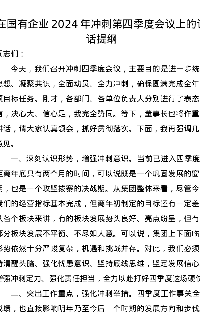 在国有企业2024年冲刺第四季度会议上的讲话提纲