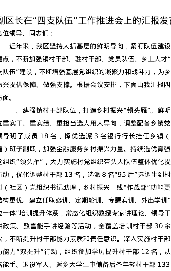 副区长在“四支队伍”工作推进会上的汇报发言