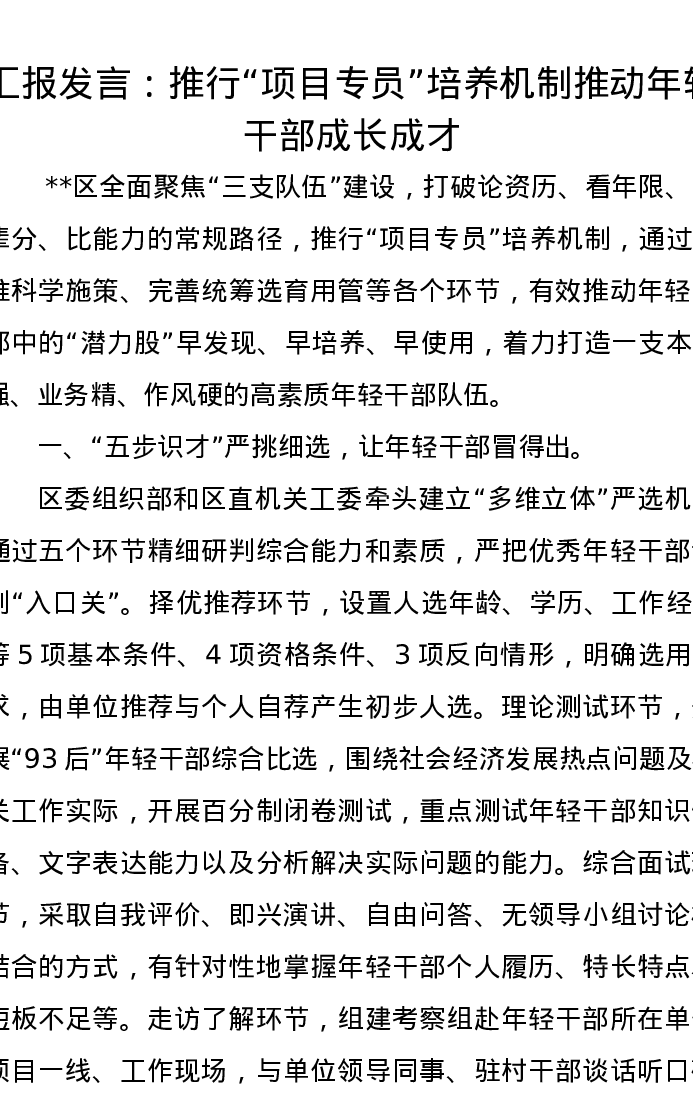 汇报发言:推行“项目专员”培养机制推动年轻干部成长成才