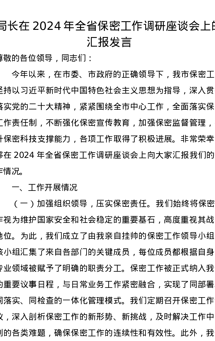 局长在2024年全省保密工作调研座谈会上的汇报发言
