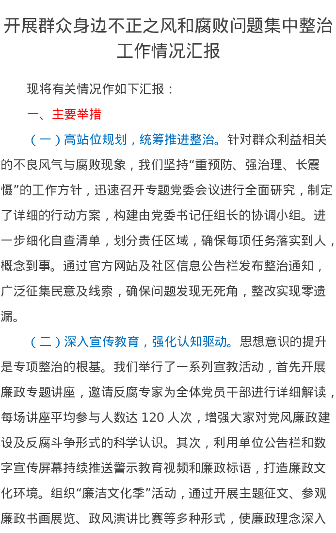 开展群众身边不正之风和腐败问题集中整治工作情况汇报
