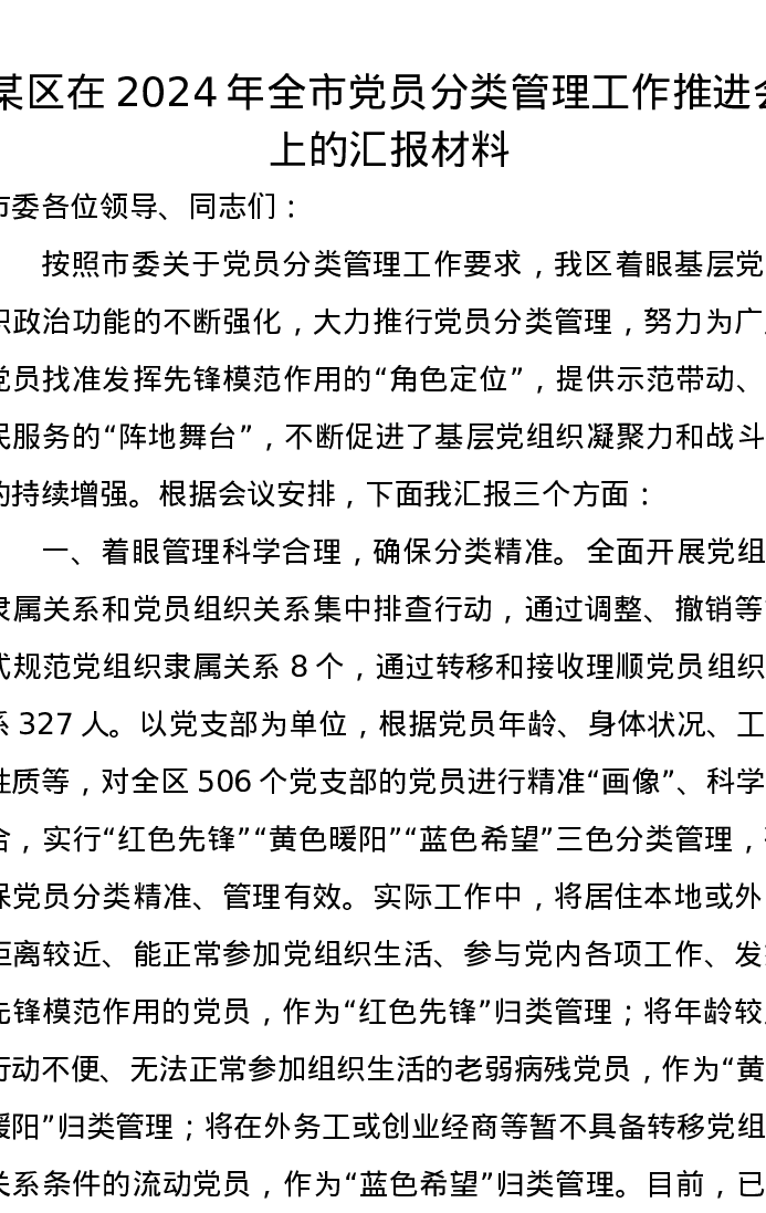 某区在2024年全市党员分类管理工作推进会上的汇报材料
