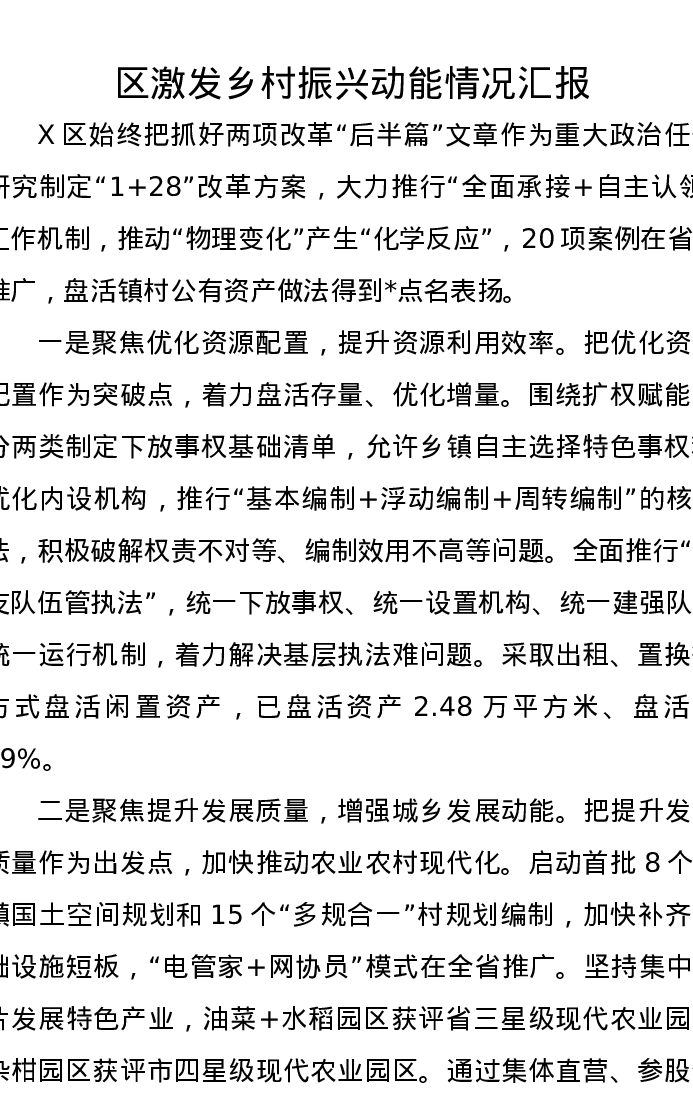 区激发乡村振兴动能情况汇报