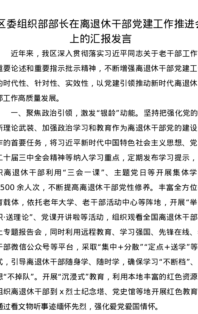 区委组织部部长在离退休干部党建工作推进会上的汇报发言