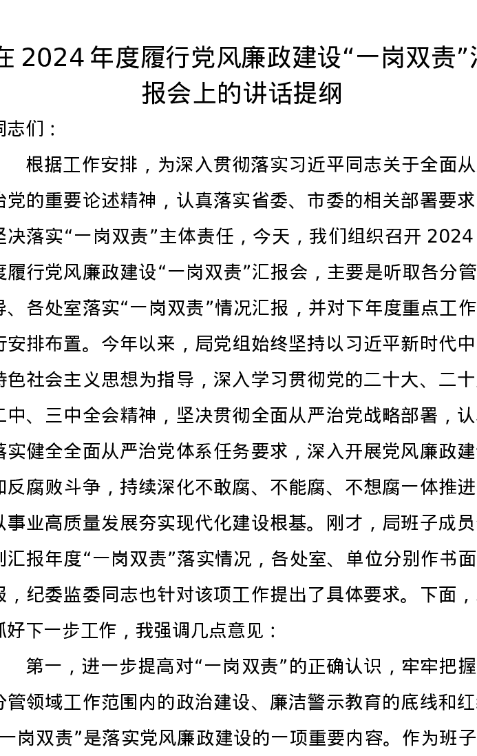 在2024年度履行党风廉政建设“一岗双责”汇报会上的讲话提纲