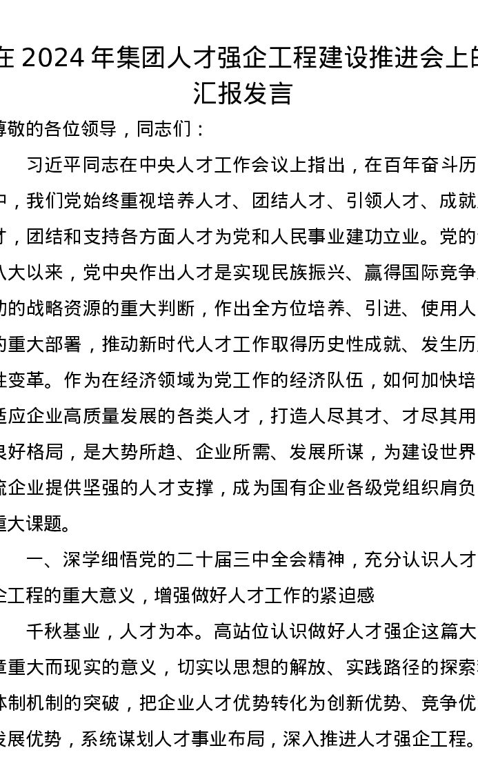 在2024年集团人才强企工程建设推进会上的汇报发言