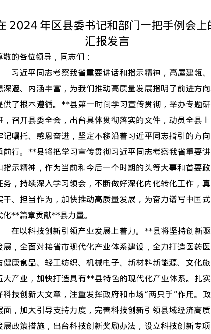 在2024年区县委书记和部门一把手例会上的汇报发言