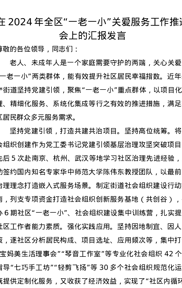 在2024年全区“一老一小”关爱服务工作推进会上的汇报发言