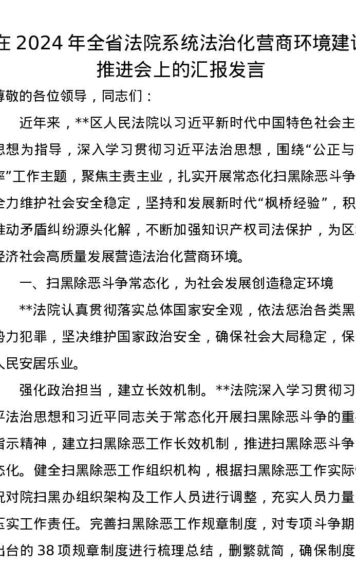 在2024年全省法院系统法治化营商环境建设推进会上的汇报发言
