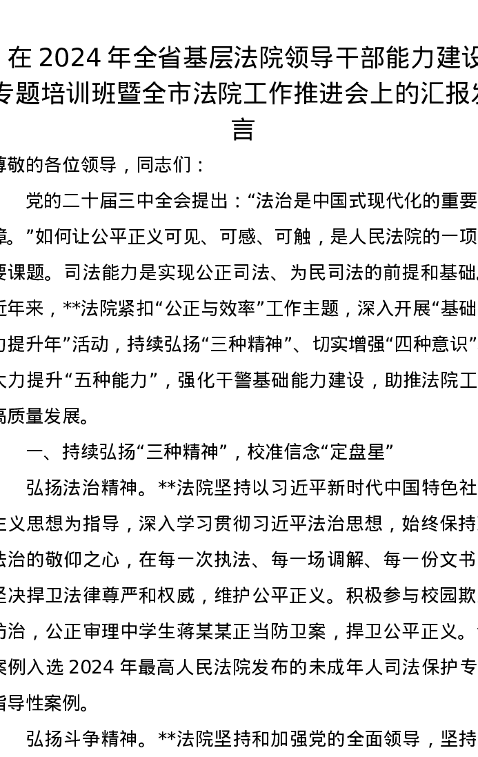 在2024年全省基层法院领导干部能力建设专题培训班暨全市法院工作推进会上的汇报发言