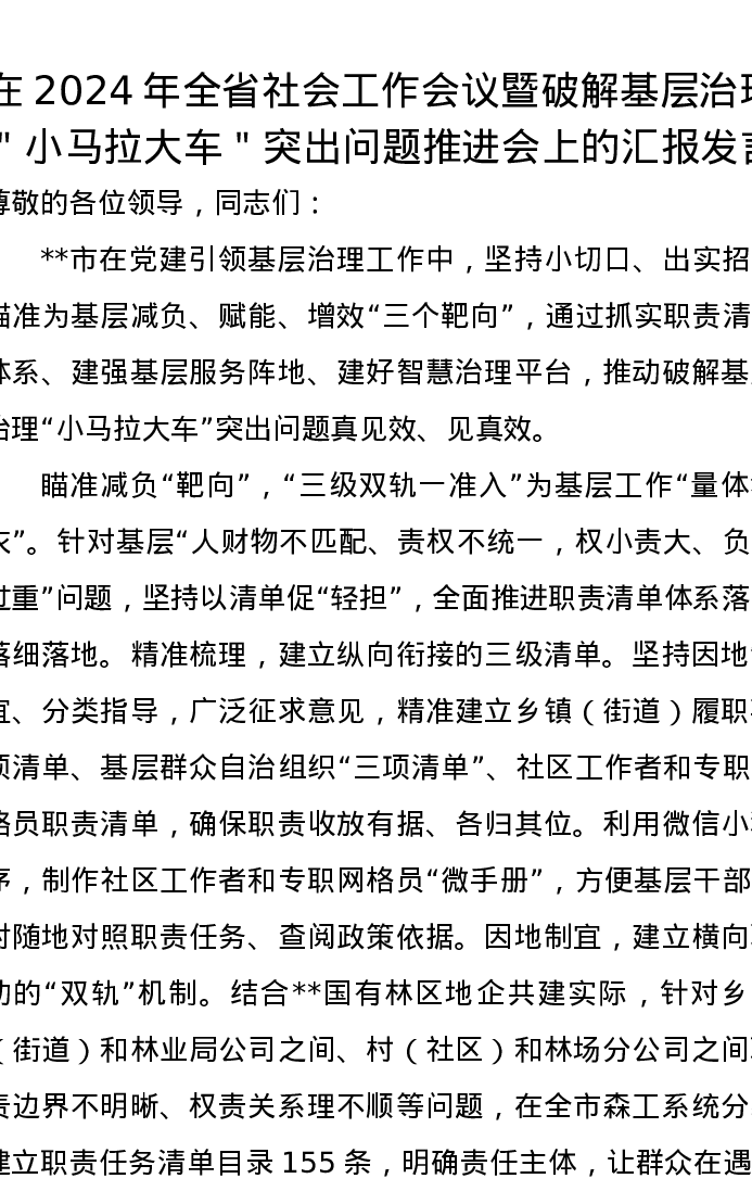 在2024年全省社会工作会议暨破解基层治理"小马拉大车"突出问题推进会上的汇报发言