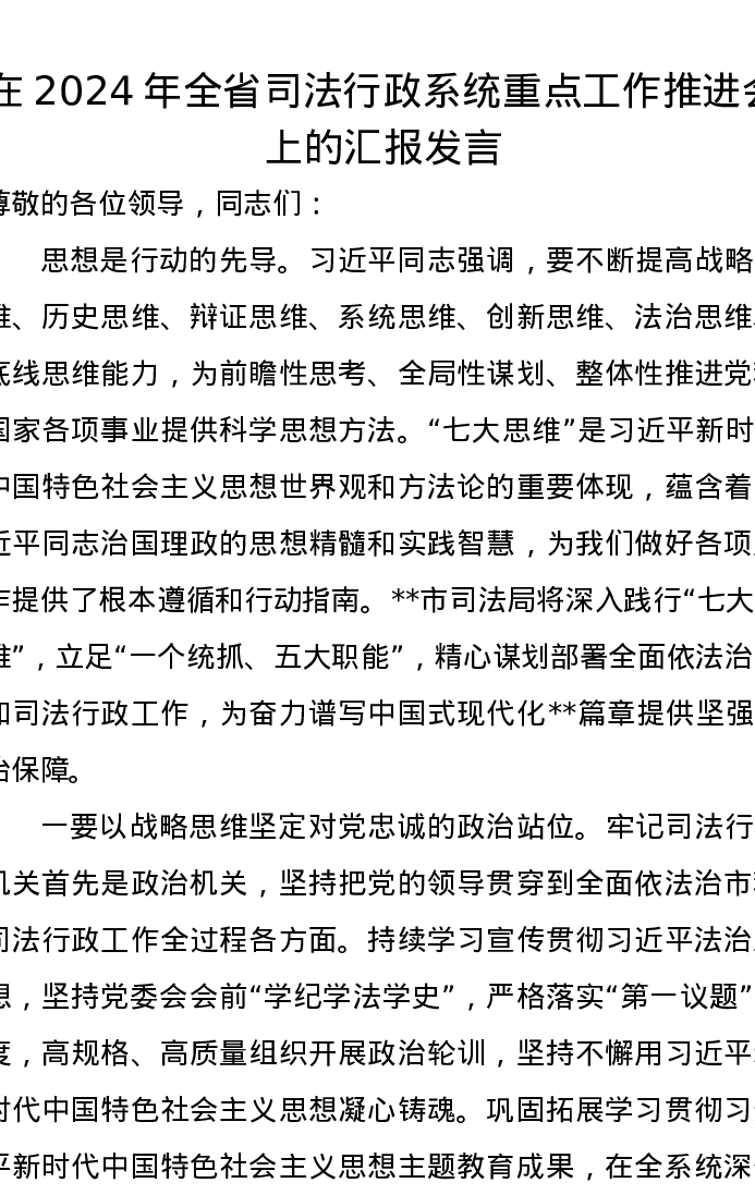 在2024年全省司法行政系统重点工作推进会上的汇报发言