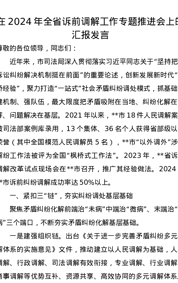 在2024年全省诉前调解工作专题推进会上的汇报发言