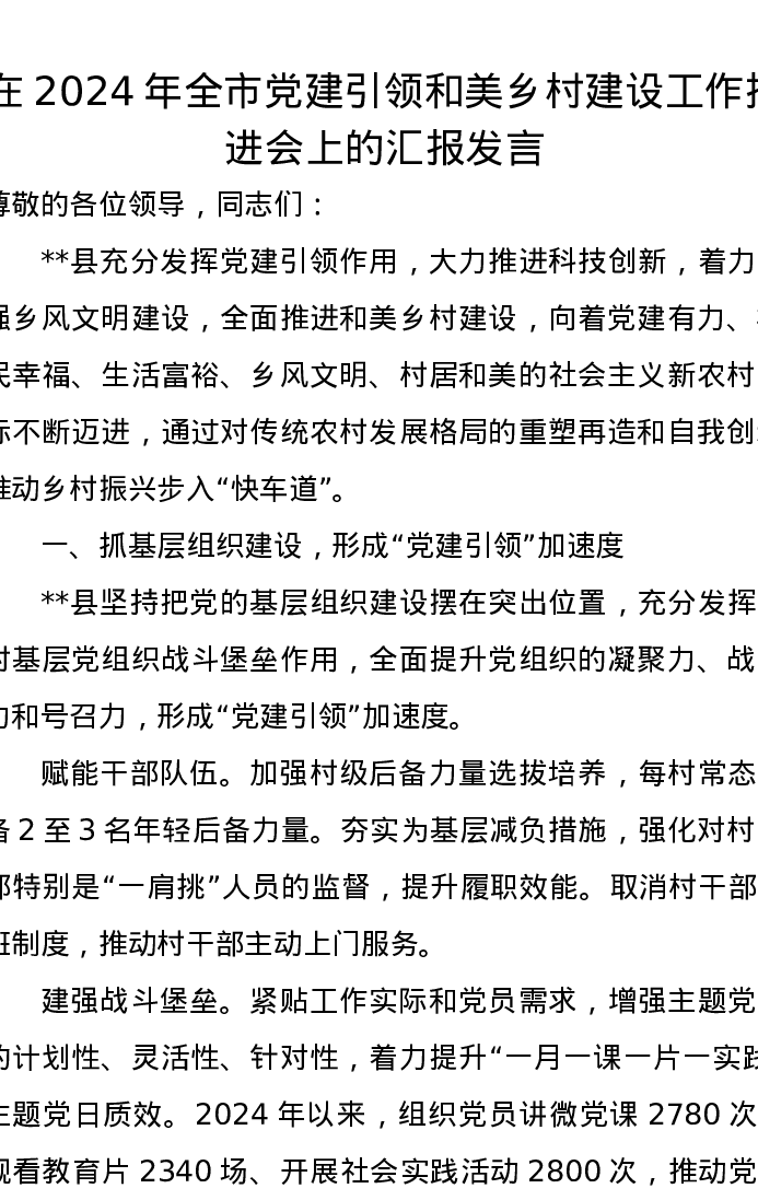 在2024年全市党建引领和美乡村建设工作推进会上的汇报发言