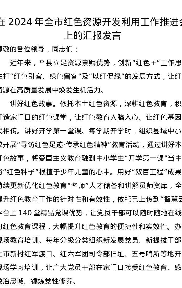 在2024年全市红色资源开发利用工作推进会上的汇报发言