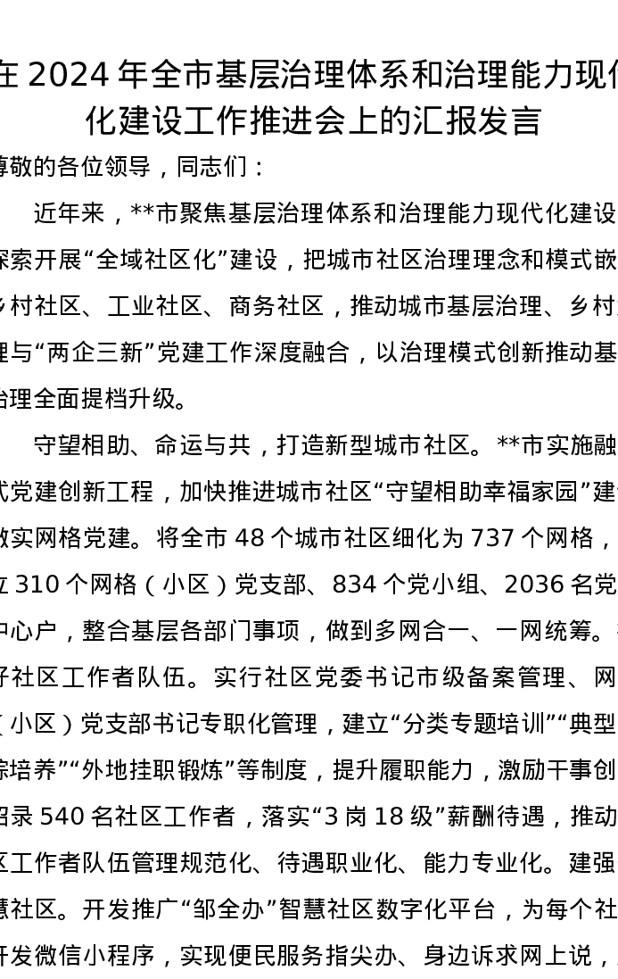 在2024年全市基层治理体系和治理能力现代化建设工作推进会上的汇报发言