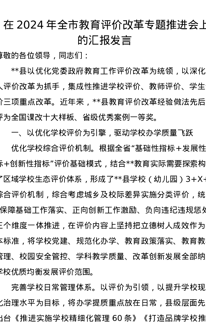 在2024年全市教育评价改革专题推进会上的汇报发言