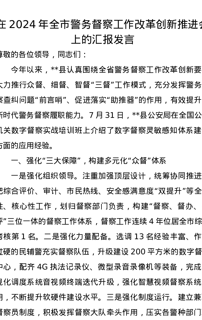 在2024年全市警务督察工作改革创新推进会上的汇报发言