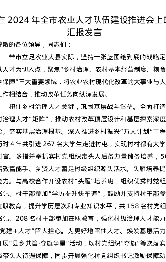 在2024年全市农业人才队伍建设推进会上的汇报发言