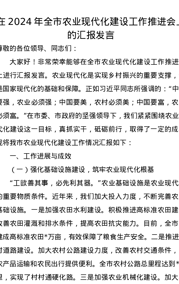 在2024年全市农业现代化建设工作推进会上的汇报发言