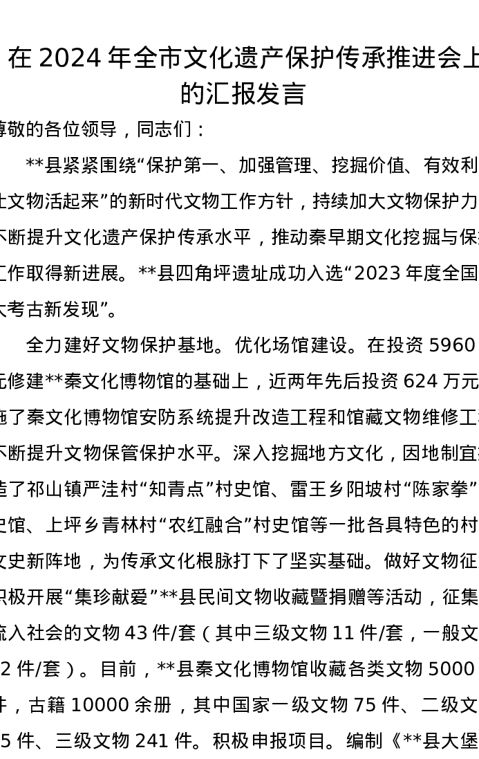 在2024年全市文化遗产保护传承推进会上的汇报发言