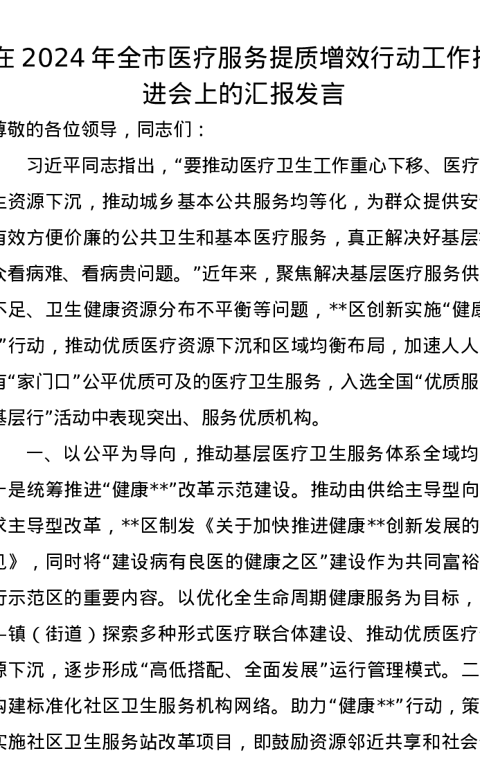 在2024年全市医疗服务提质增效行动工作推进会上的汇报发言