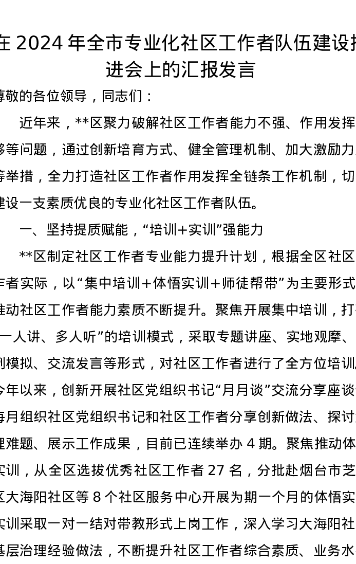 在2024年全市专业化社区工作者队伍建设推进会上的汇报发言