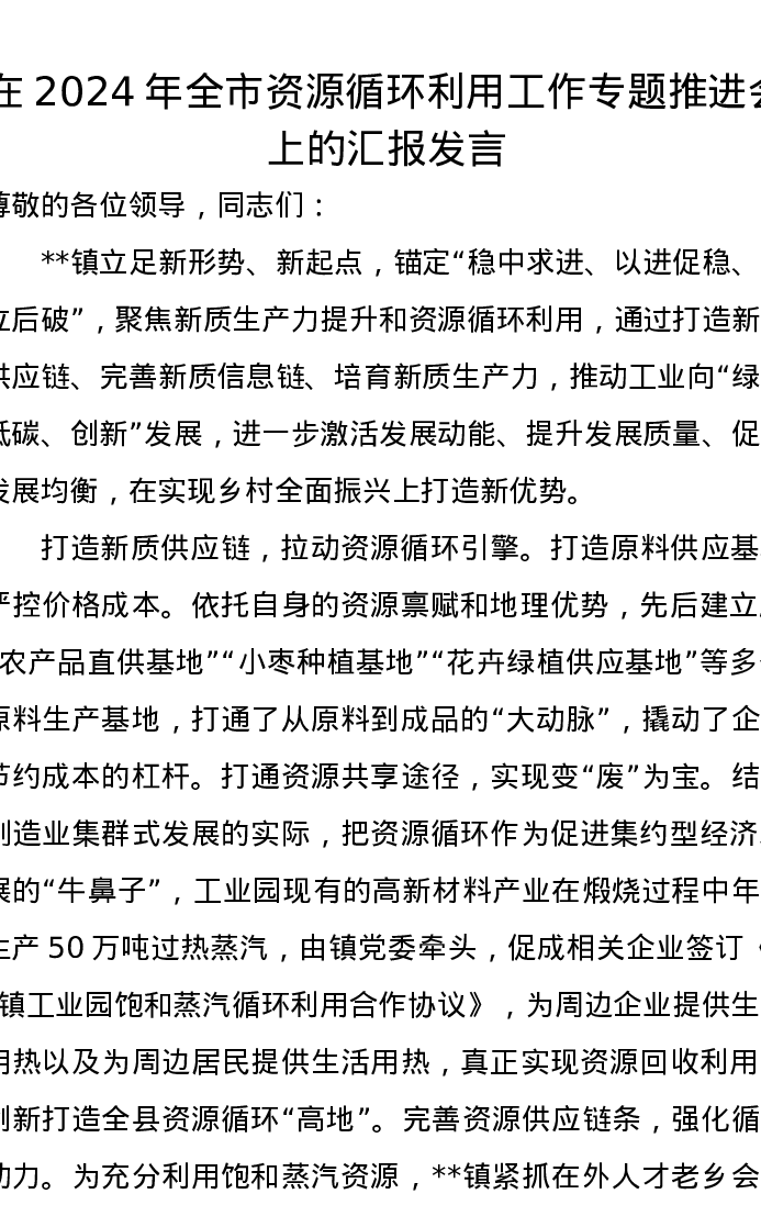 在2024年全市资源循环利用工作专题推进会上的汇报发言