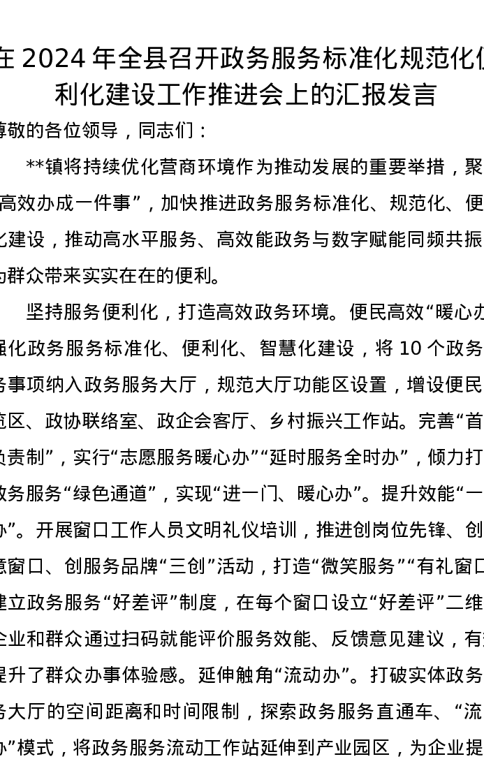 在2024年全县召开政务服务标准化规范化便利化建设工作推进会上的汇报发言