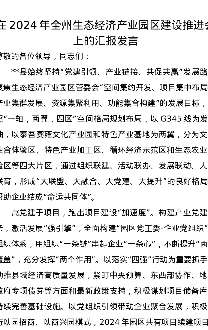 在2024年全州生态经济产业园区建设推进会上的汇报发言