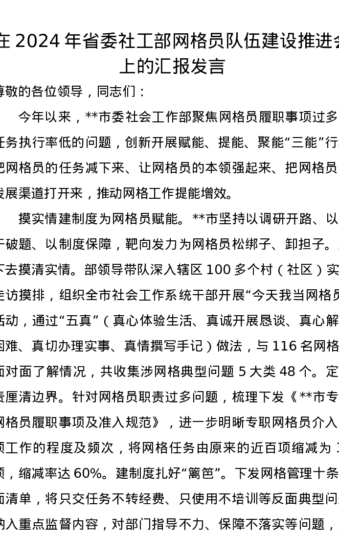 在2024年省委社工部网格员队伍建设推进会上的汇报发言