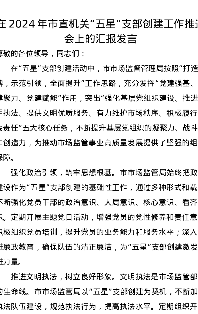 在2024年市直机关“五星”支部创建工作推进会上的汇报发言
