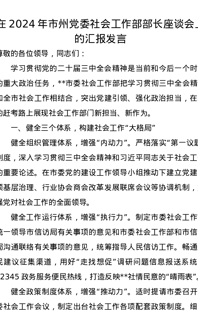 在2024年市州党委社会工作部部长座谈会上的汇报发言