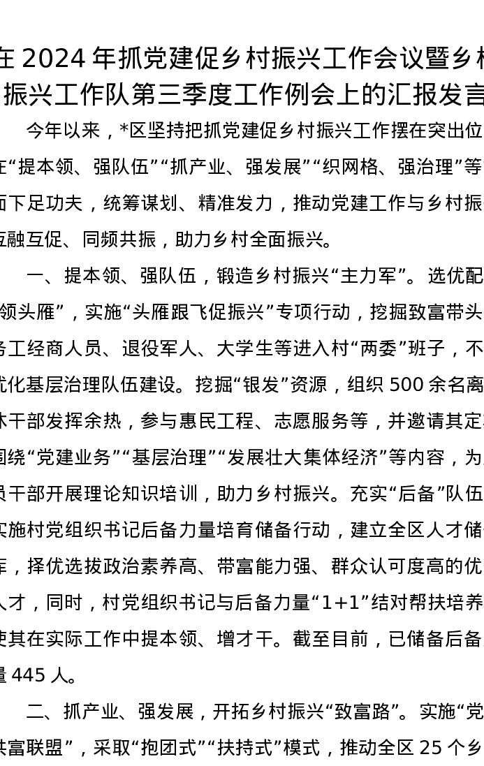 在2024年抓党建促乡村振兴工作会议暨乡村振兴工作队第三季度工作例会上的汇报发言