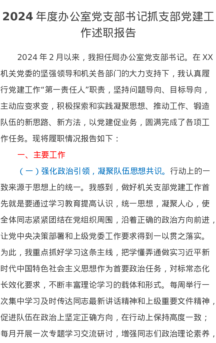 2024年度办公室党支部书记抓支部党建工作述职报告