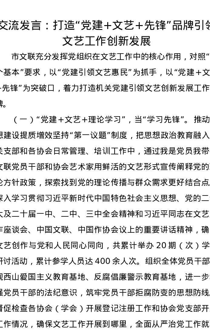 交流发言:打造“党建+文艺+先锋”品牌引领文艺工作创新发展
