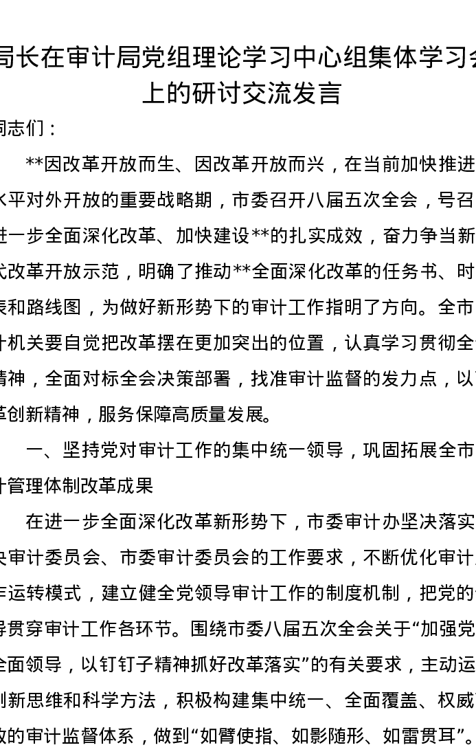 局长在审计局党组理论学习中心组集体学习会上的研讨交流发言