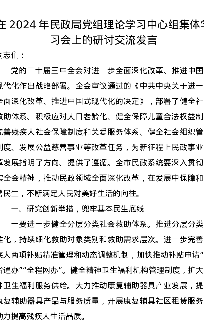 在2024年民政局党组理论学习中心组集体学习会上的研讨交流发言