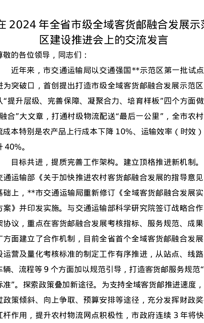 在2024年全省市级全域客货邮融合发展示范区建设推进会上的交流发言