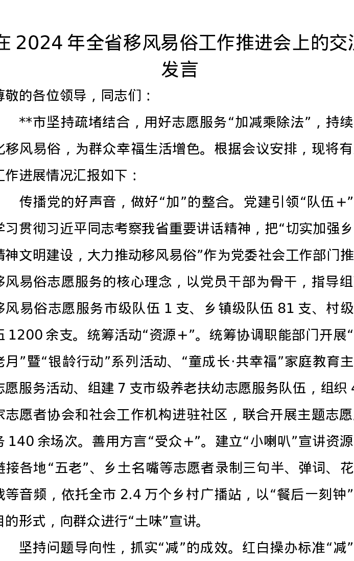 在2024年全省移风易俗工作推进会上的交流发言