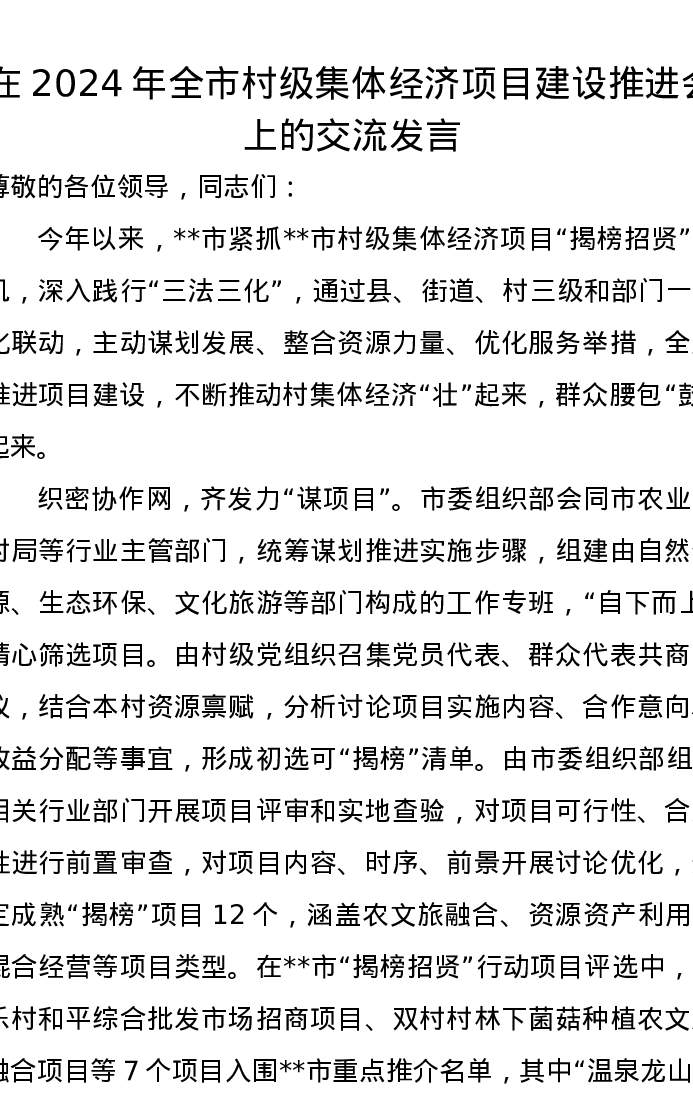 在2024年全市村级集体经济项目建设推进会上的交流发言