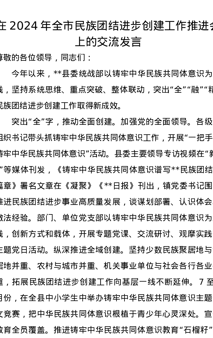 在2024年全市民族团结进步创建工作推进会上的交流发言