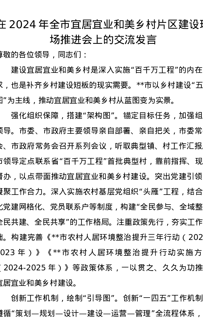 在2024年全市宜居宜业和美乡村片区建设现场推进会上的交流发言