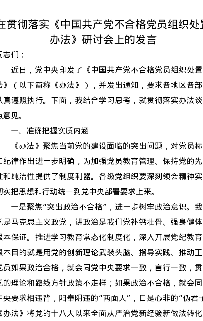 在贯彻落实《中国共产党不合格党员组织处置办法》研讨会上的发言