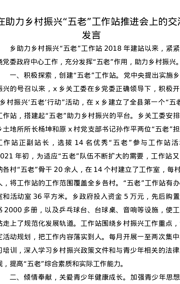 在助力乡村振兴“五老”工作站推进会上的交流发言