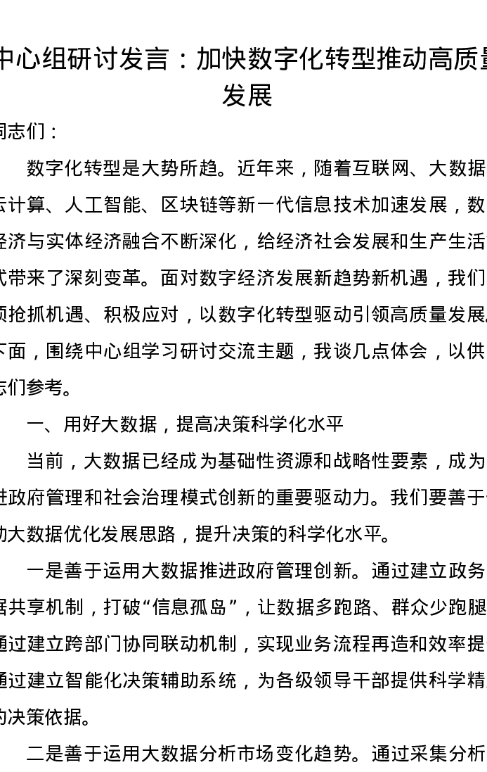 中心组研讨发言:加快数字化转型,推动高质量发展