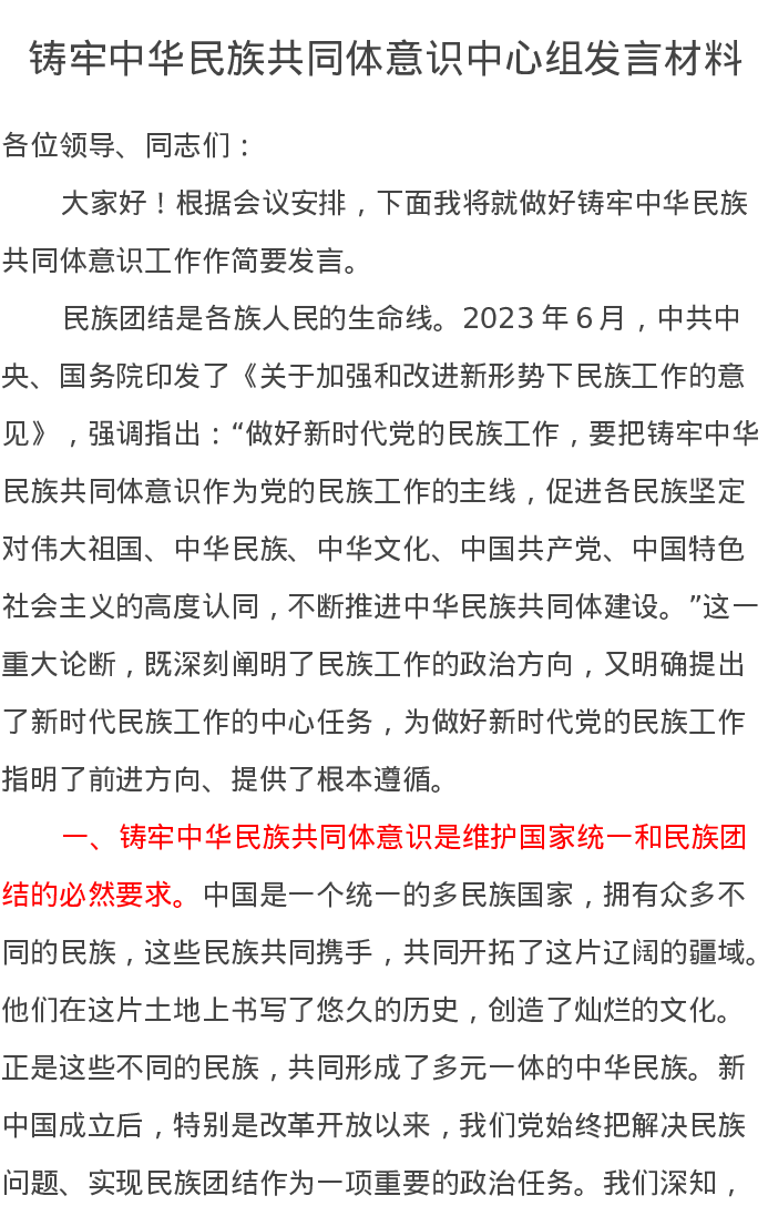 铸牢中华民族共同体意识中心组发言材料