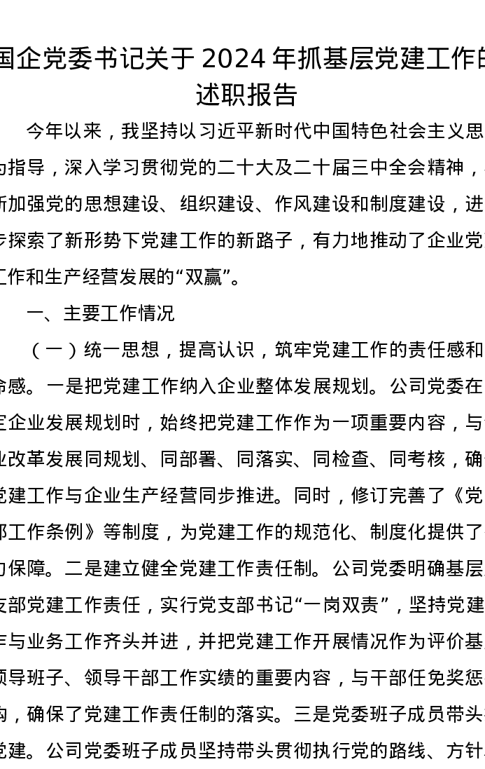 国企党委书记关于2024年抓基层党建工作的述职报告